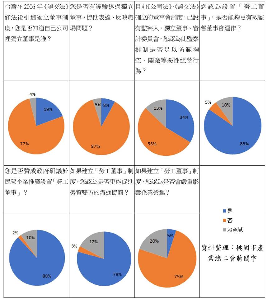 桃園市產業總工會在2017年,曾經針對新北、雲林、桃園等地區,超過200個企業工會幹部進行問卷調查。統計結果,有77%的企業工會幹部不知道自己企業的獨立董事是誰,更只有8%的工會幹部透過獨立董事協助表達、反映職場問題。這裡還未細究透過這個管道的效果如何,但已經可以從稀少可憐的數量證明,獨立董事制度並未發揮「協助勞方表達立場,並監督董事會運作」的效果!