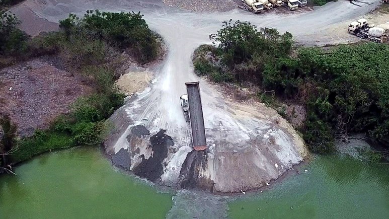 高雄市美濃區成功新村附近,有一個過去盜挖砂石遺留的巨大石坑,形狀像個彎月,面積約四公頃,坑內積水成為湖泊,四周綠樹圍繞,形成一個廣大水域環境。去年底,附近有大量卡車進出,並且載運來不明土方,向水域不斷傾倒。日前更以空拍機目擊卡車傾倒行為,激起水面漣漪。