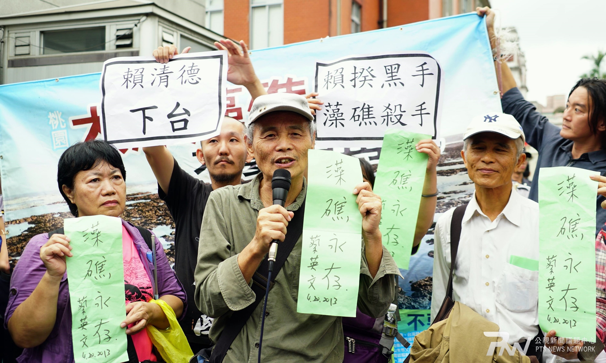 長期為環境奮戰的彰化環盟總幹事施月英,七年前為了救大城濕地,曾經來到總統府,七年後為了救觀音藻礁,再度來到總統府,這次多了兒子陪伴。她表示,大城濕地和大潭藻礁都是重要濕地,全民都該守護,政府強勢通過環評的方式,現在和過去都是一樣!