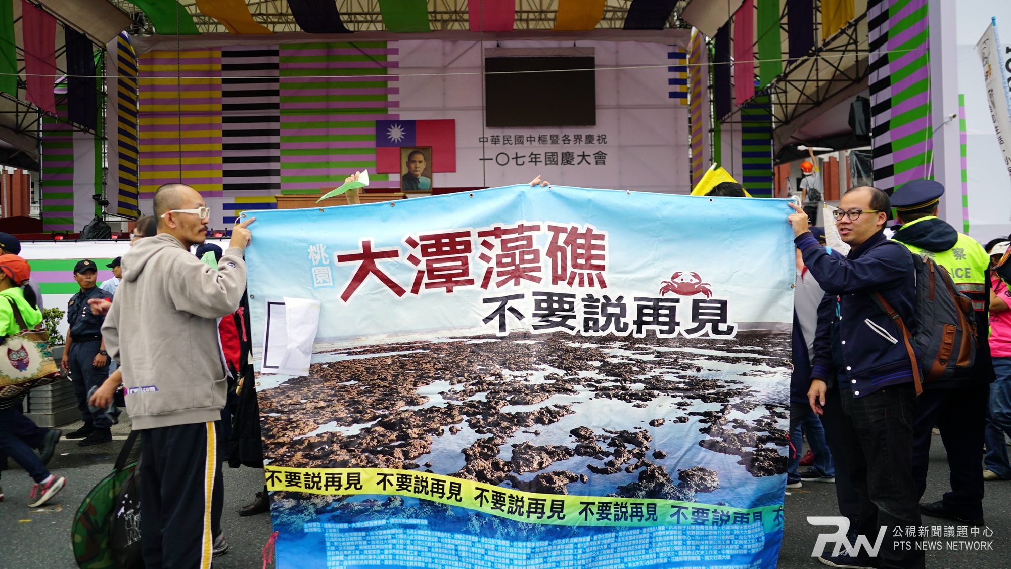 一群人分成多路,在警方來不及攔阻下,前進到總統府前的國慶觀禮台下,舉著蔡英文過去所寫的「守護藻礁」,大聲呼籲總統撤案,驚動府內的維安人員,以及緊急到場的警力,成群衝出布置防線。抗議團體在觀禮台前來回散步抗議,成為國慶前夕,突發版的民間抗議大遊行。
