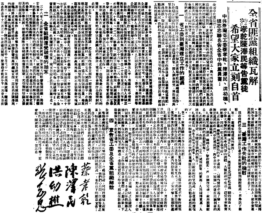 「願最後以臺灣省工委的資格,對全省中共黨員進一忠告」、「希望大家立刻依照政府規定的自首辦法,自動交出一切組織關係」、「終結工委會自成立以來的發展」、「以迅速終結整個案件,而澄清臺灣的社會局面」。在這一個暫時性的安身之處,破舊宿舍木質地板上放著五月十四日的《中央日報》,刊登了蔡孝乾、陳澤民、洪幼樵以及張志忠等四人的照片,以及附有親筆簽名、聯名發表的「告臺灣全省中共黨員書」。